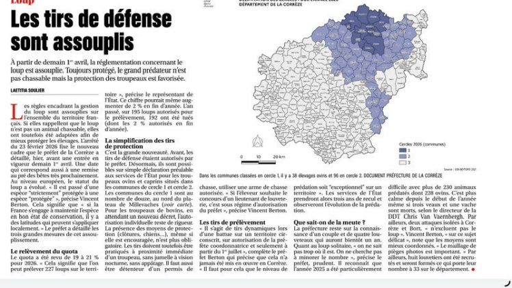 La nouvelle mouture du cadre réglementaire permettra, à partir de juillet 2026, de réaliser des tirs de prélèvement dans le cas de « situations de prédations exceptionnelles » couplées « à l’inefficacité des tirs de défense ». À l’échelle nationale, le taux de prélèvement du loup a été revu à la hausse, passant de 19 % à 21 %, ce qui représente 227 individus.