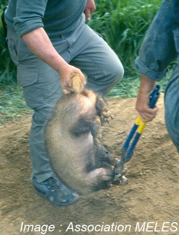 – Saisie violente avec une pince : Il est très fréquent que l’animal soit retiré de son terrier avec des pinces métalliques le saisissant au niveau du cou, du museau ou de la patte.
